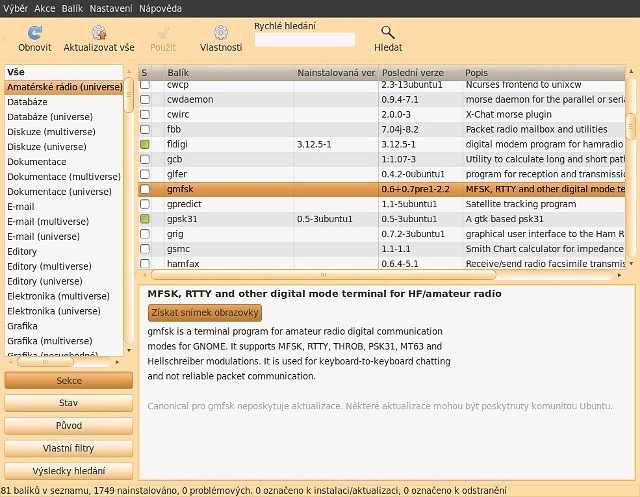 si vyplníte, tím více programů vám správce nabídne. Pokud si vyplníte správný apt řádek, nabídne vám stovky radioamatérských balíků,